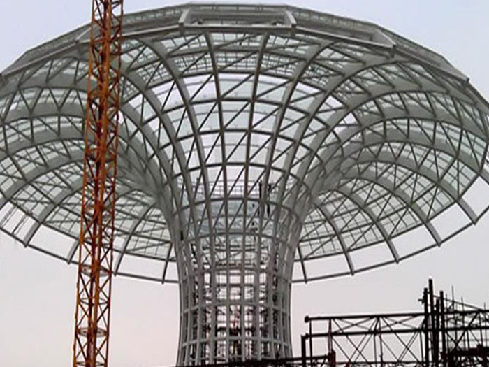 二、球形网架结构因其结构新颖,受力合理,自重轻、用钢量低等优点。如大型体育场馆球形阿拉善盟螺栓球网架、公共场馆球形网架、电厂阿拉善盟螺栓球网架、水泥工业球形网架、仓储物流球形网架、阿拉善盟干煤棚工业球形网架、阿拉善盟收费站阿拉善盟加油站球形网架、展览中心、影剧院、商场、航站楼、候车厅、工厂阿拉善盟车间、仓库、电视塔等球形螺栓球节点网架。国内球形网架结构主要分为:阿拉善盟焊接球节点网架及螺栓球节点网架两种。螺栓球节点网架其构件工厂内加工量较大,现场安装便捷,适用于现场工期紧,阿拉善盟施工条件、用电量受制约,网架形状复杂、阿拉善盟杆件定位困难的异形结构。螺栓球节点球形网架系统基本由阿拉善盟杆件、螺栓球、支撑支座等组成。按照节点形式可分为交叉阿拉善盟桁架体系、四角锥体系、三角锥体系等。支撑方式多为固定支座支撑。对于大面积、大跨度及有特殊受力或伸缩要求的网架结构可采用橡胶支座、滑移支座、球铰支座等支撑形式,以满足结构自身的受力稳定、均衡,便于内力释放等设计要求。